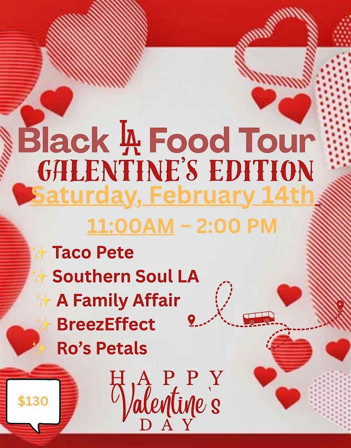 Spend Galentine’s Day strolling through Los Angeles with an all-women group, stopping at some of the city’s most loved Black-owned gems. This curated food stroll includes flavorful bites from Taco Pete, soulful classics at Southern Soul LA, and comforting favorites from A Family Affair. We’ll enjoy wine from BreezEffect and end with a beautiful floral moment courtesy of Ro's Petals.