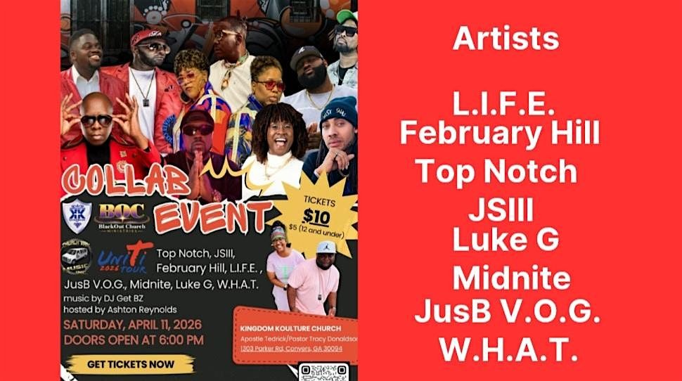Join us on April 11th for this FREE concert featuring the artists JusB V.O.G., February Hill, Top Notch, L.I.F.E., Luke G, JSIII, W.H.A.T., Midnite and hosted by Ashton Reynolds.