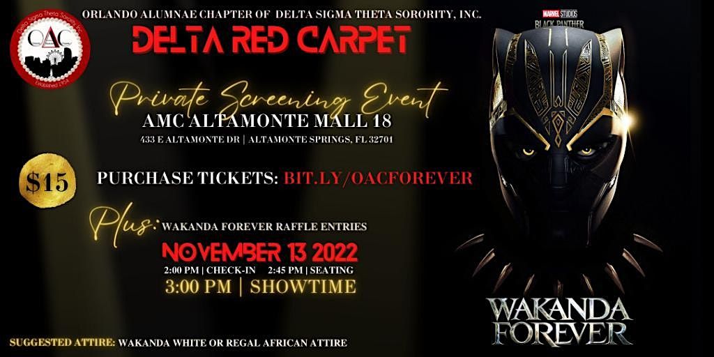 Join the Orlando Alumnae Chapter of Delta Sigma Theta Sorority, Inc. as we present our Delta Red Carpet screening of Black Panther: Wakanda Forever.