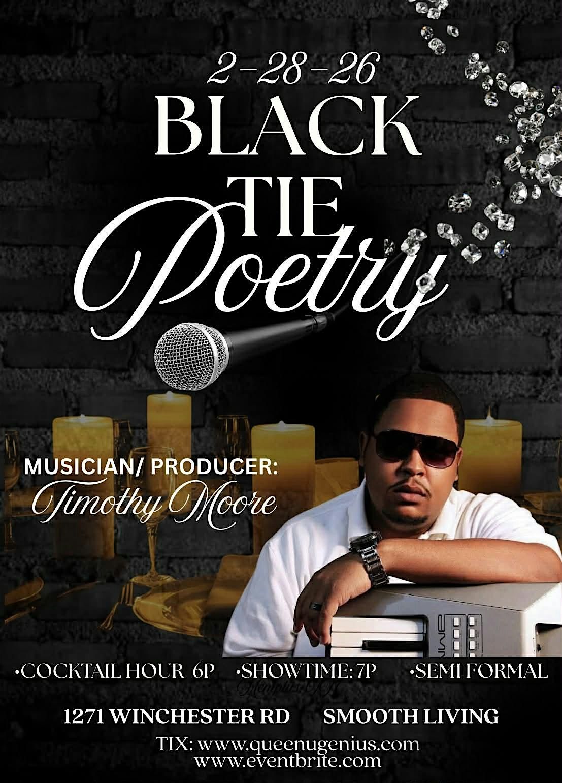 This in-person event brings together poetry, RnB, and a night full of class, a lil boughetto fun, & heartfelt moments. Whether you're a poetry newbie or a seasoned lover, BLACK TIE POETRY is the place to be. Put on your best black tie look -black is not required-Semi Formal ATTIRE IS-and join us for a night made of memories. Cocktail Hour will include light refreshments. Full Kitchen and comfortable seating. Live Performance by Musician & Producer, Timothy Moore! Hosted By Comedian Cowboy Fly. LIMITED SEATING -$25 Per Person TIX