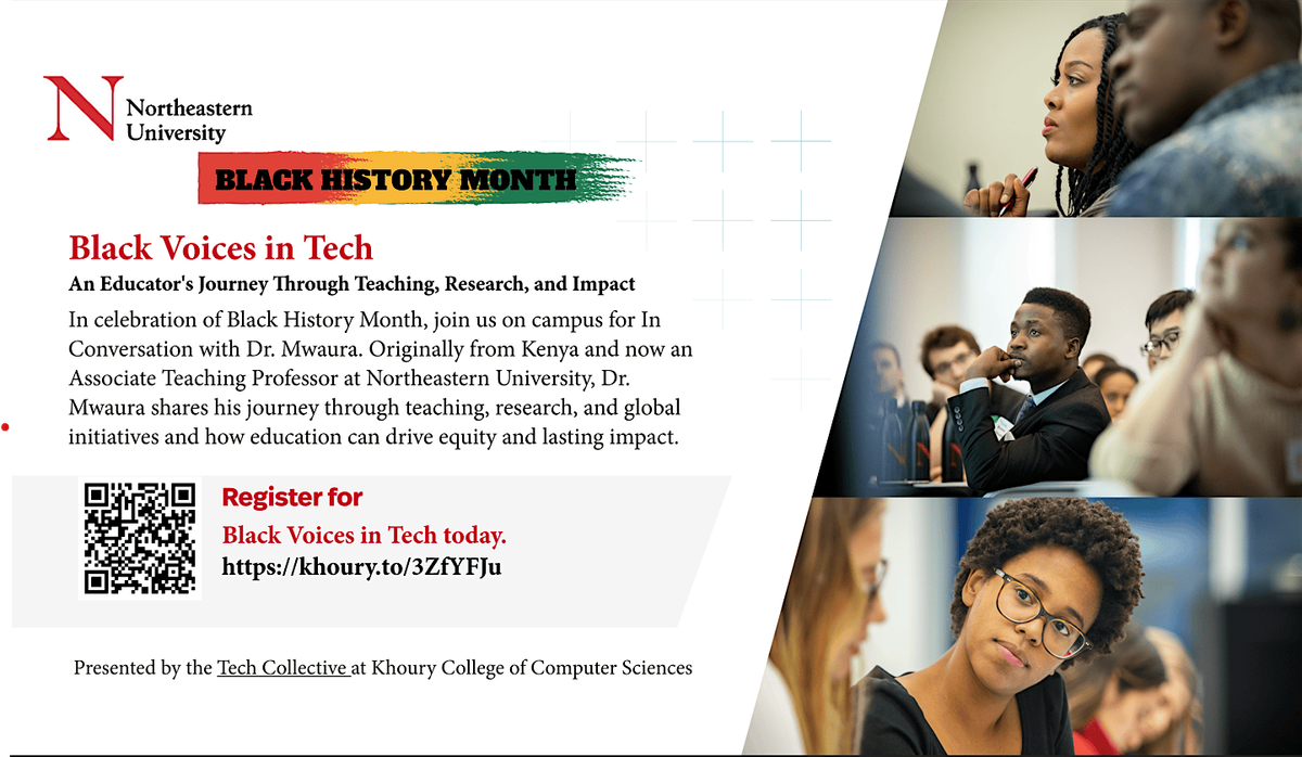 In celebration of Black History Month, join us for In Conversation with Dr. Mwaura, a candid look at an educator’s journey across continents, disciplines, and communities. Originally from Kenya and now an Associate Teaching Professor at Northeastern University, Dr. Mwaura reflects on his path through teaching, research, and service, and how those experiences shape his commitment to broadening participation in computing. From AI and algorithms classrooms to global initiatives like AI for Agriculture and international exchange programs, this conversation explores how education, when done with intention, can be a powerful tool for equity, opportunity, and long-term impact.