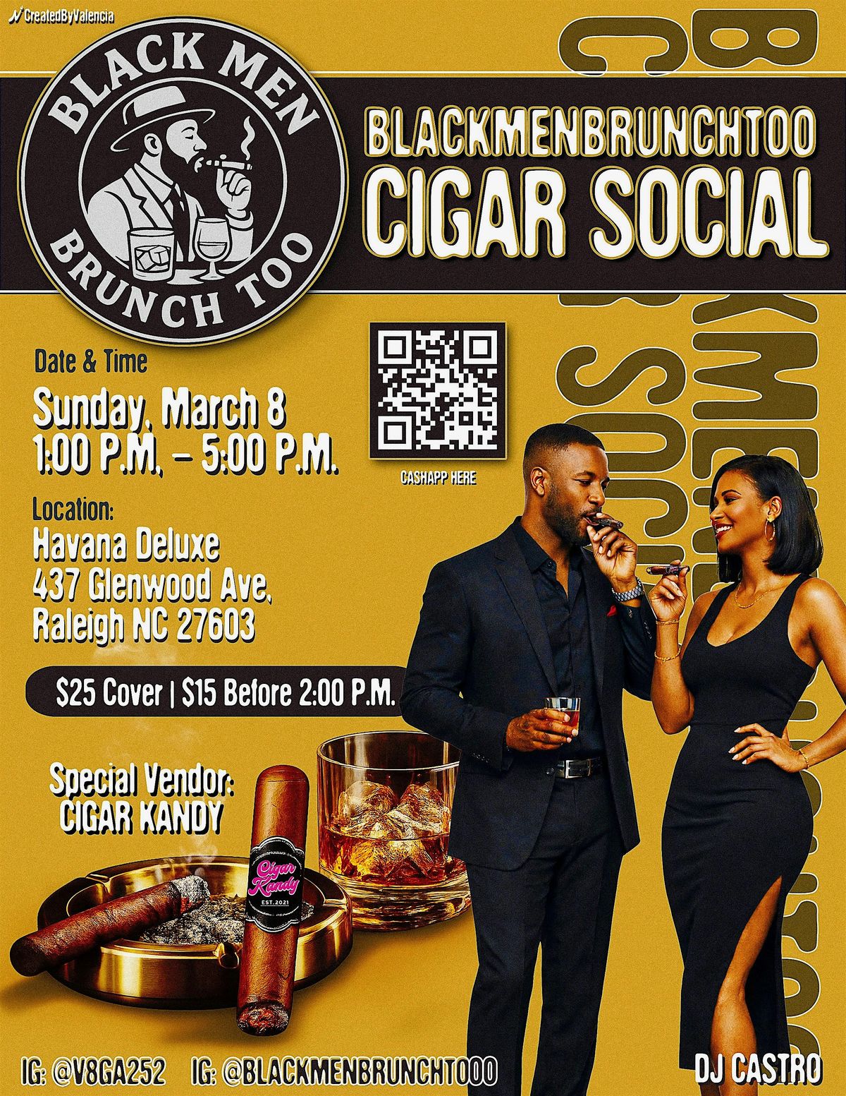 It’s that time again!!! Ladies and Gentlemen @blackmenbrunchtooo are throwing another Coed Cigar Social @haveacigar_nc on March 8th from 1-5pm. I know it’s been cold and Snowy but we back outside lol. $25 at the door or early bird special $15 b4 2:00pm. Special Cigar vendor the beautiful @cigarkandy and @djcastro setting the vibes. Food catered by @alibighouse and @dave_ja_vue. Inbox for more info. Cash app $V8ga.