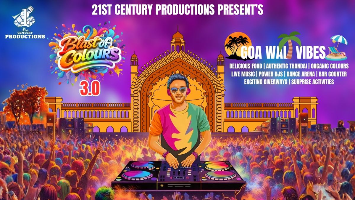 BLAST OF COLOURS 3.0 – Holi Festival 2026Lucknow’s Biggest Goa-Style Holi CelebrationGet ready to dive into colours, music, madness, and pure GOA vibes as BLAST OF COLOURS 3.0 returns—bigger, louder, and crazier than ever!This Holi, don’t just play with colours—live the experience.Presented by 21st Century Productions, this 3-day mega Holi carnival promises high-energy music, stunning jungle-themed décor, organic colours, top DJs, delicious food, authentic thandai, bar counters, and unforgettable moments—all in one epic festival.🎧 What Makes It Unmissable• Goa-style open-air Holi vibes• Massive jungle and neon-themed décor• Power DJs and live music all day• Organic, skin-safe colours• Dedicated dance arena• Delicious food and shopping stalls• Authentic Holi thandai• Bar counter (as per legal norms)• Giveaways, surprise acts, and fun activities• Safe, secure, and professionally managed festival experience👗 Dress CodeWhite, festive, or comfortable Holi attire is recommended.⚠️ Important Information• Outside food, drinks, and colours are not permitted• Alcohol will be served only to guests of legal drinking age with valid ID• Entry is subject to security checks and organizer discretion• Event photography and videography will be conducted