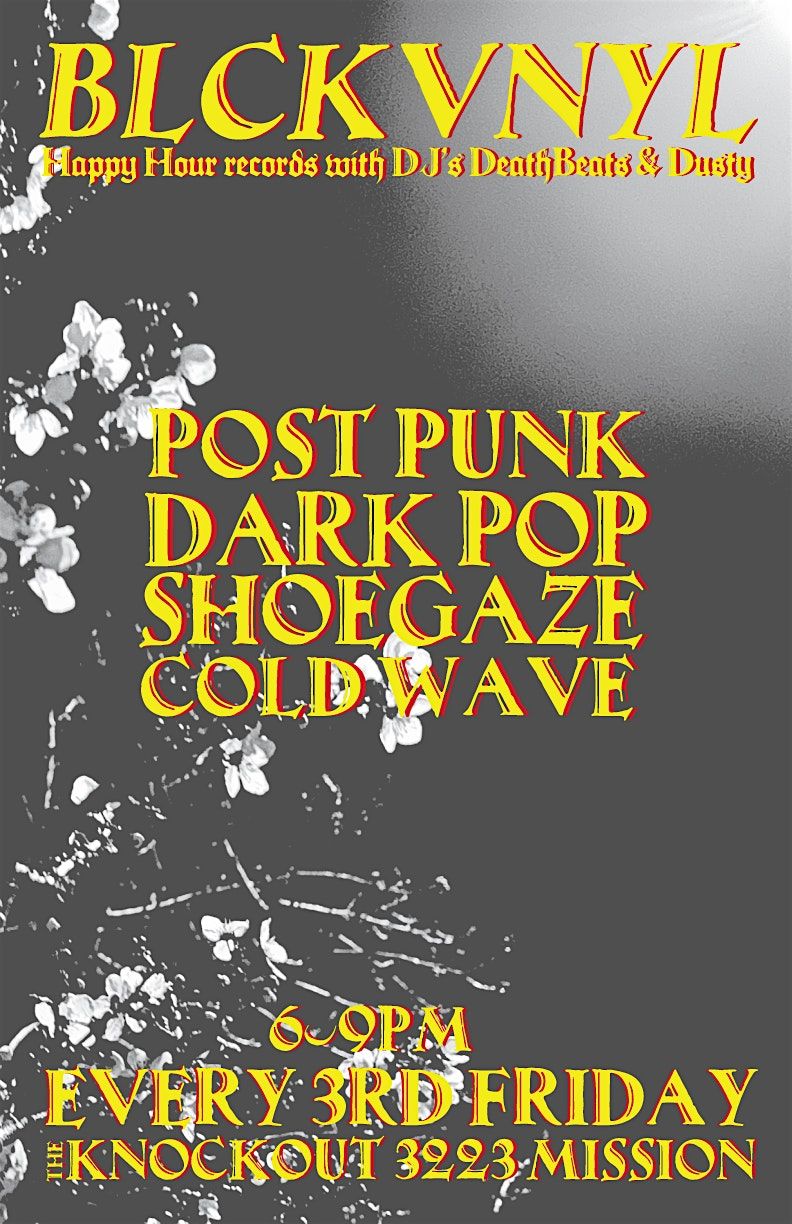 DJ's DeathBeats and Dusty bring you BLCK VNYL, an all vinyl GOTH, DARK POP, POST PUNK, SHOE GAZE, & COLD WAVE happy hour at the KNOCKOUT in San Francisco's Mission District. Happens every 3rd Friday of the month from 6-9pm. FREE! CHEAP DRINKS!