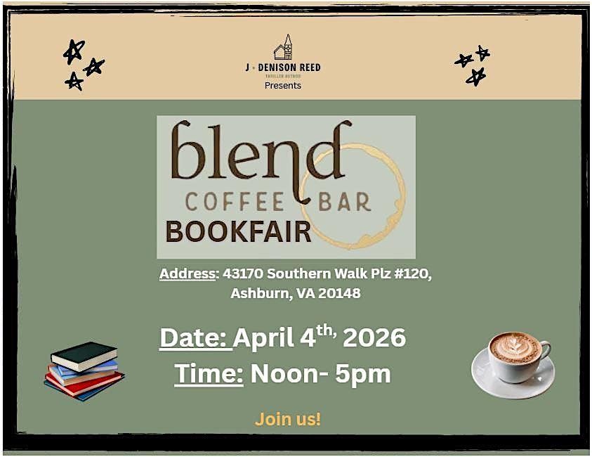 Authors of all genres will be in attendance from Noon to 5pm, April 4th 2026 at the Blend Coffee Bar in Broadlands, VA.
