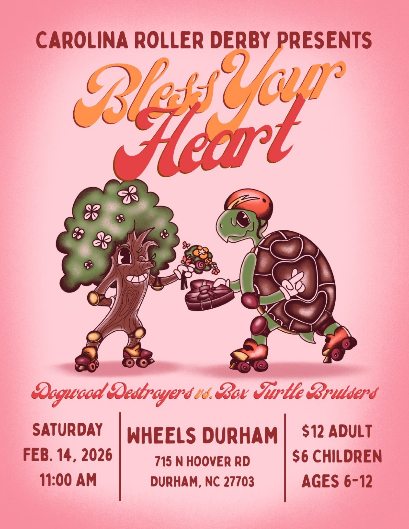 Carolina Roller Derby is putting on their southern charm (and shade) with Bless Your Heart, a home teams game on Saturday, Feb. 14! Catch the Dogwood Destroyers take on the Box Turtle Bruisers at Wheels Durham at 11 am. (This is your first chance to catch CRD in 2026!)