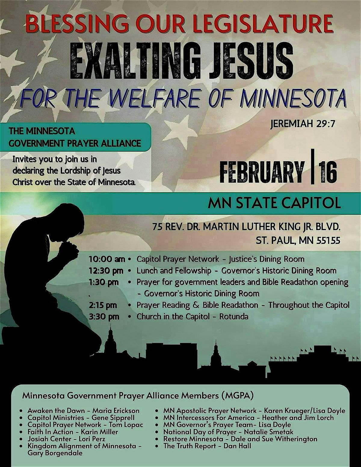 The Minnesota Government Prayer Alliance invites you to join us in declaring the Lordship of Jesus Christ over the State of Minnesota.