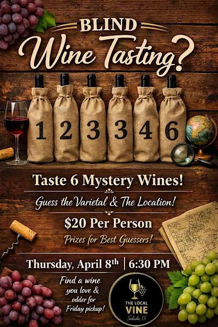 Get ready to put your palate to the test at our fun and casual Blind Wine Tasting event. No hints, no labels—just pure wine vibes and great company. Whether you're a newbie or a connoisseur, this is a perfect chance to discover new favorites and challenge your taste buds. Bring your friends and enjoy an evening full of surprises and sips!