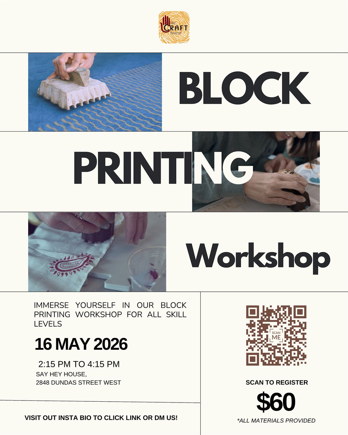 Step into the world of traditional block printing. Learn the story behind this beautiful heritage craft that has been preserved by artisan communities for centuries. Experiment with artisan hand-carved wooden blocks, and design your own hand-printed scarf and a linen drawstring bag to take home. No experience needed — just come ready to get creative.