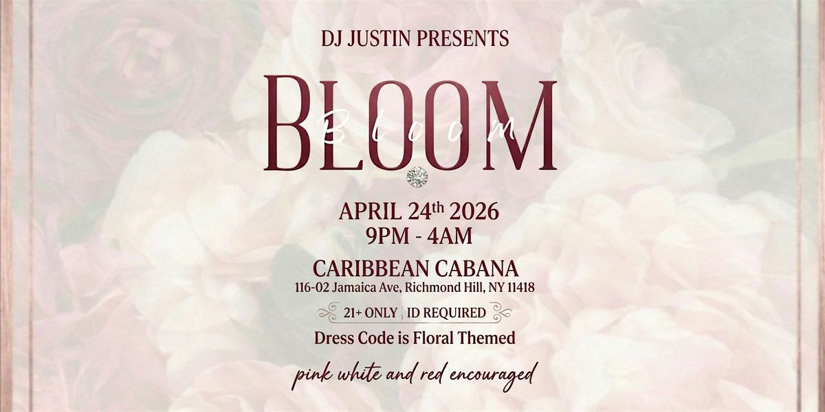 DJ Justin Presents: Bloom 2026! The ultimate spring fete filled with floral drinks, amazing aesthetics and great vibes from start to finish!About this Event