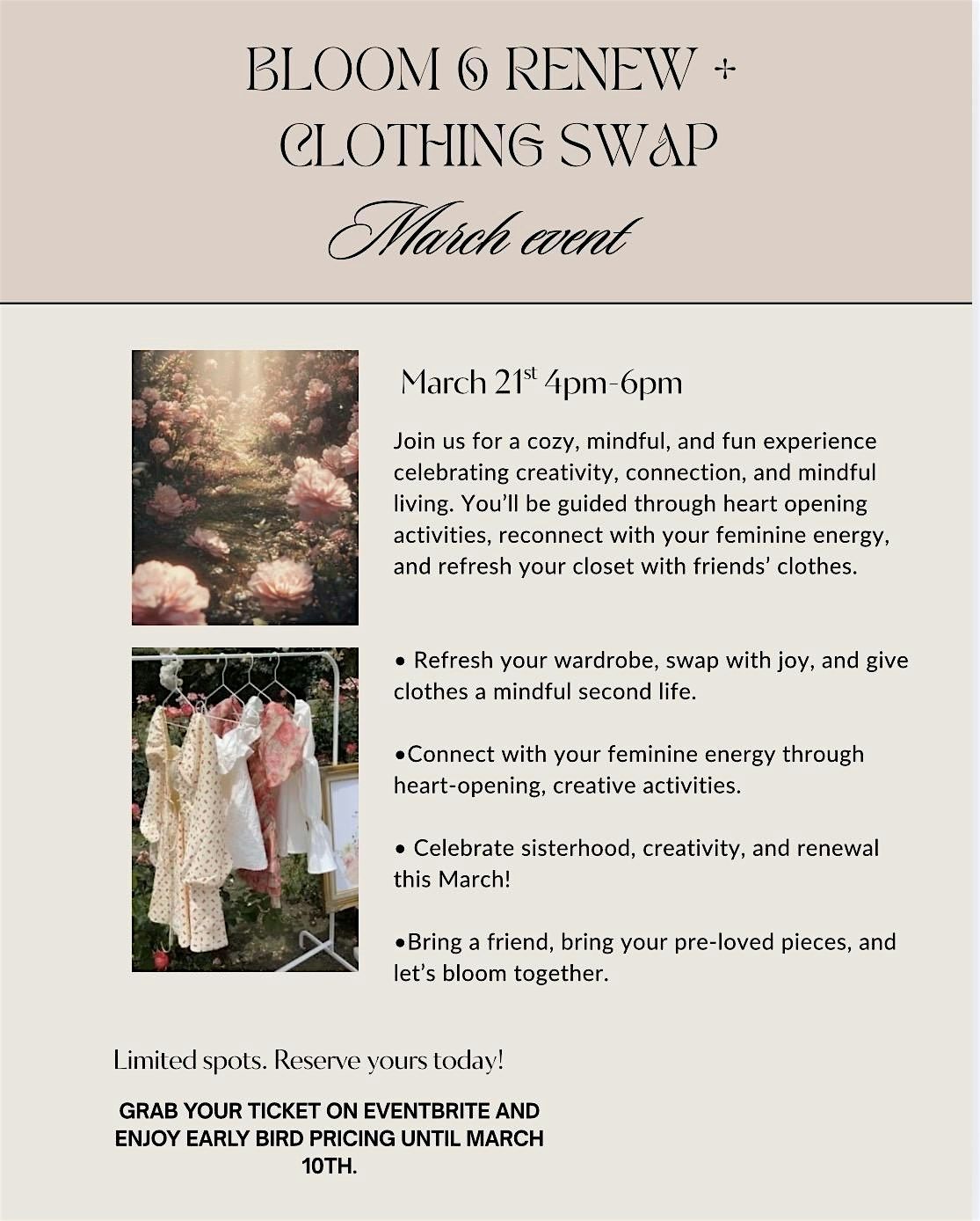 For a little extra fun, we’ll also have a clothing swap. Bring a few pre-loved pieces from your closet and discover something new-to-you. If you don’t have anything to swap, that’s completely okay come anyway and enjoy the experience.