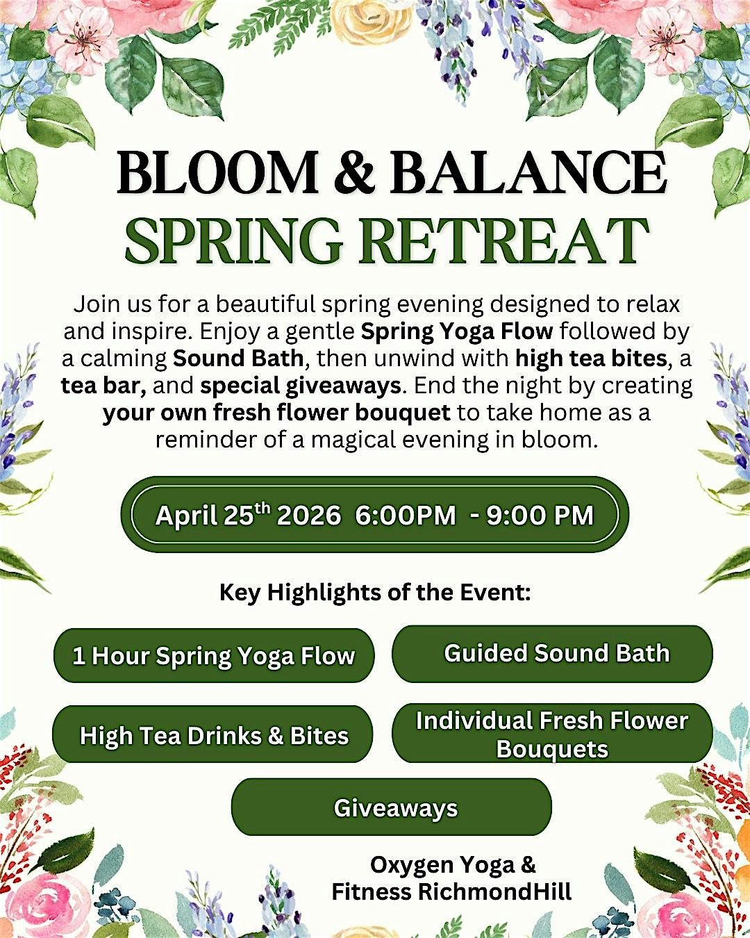 Join us at Oxygen Yoga & Fitness Richmond Hill for a chill evening of stretching, breathing, and finding your inner calm. Whether you're a yoga newbie or a pro, this event is all about feeling good and balancing your mind and body. Enjoy a one hour spring yoga flow, a sound bath, nourishing bites, giveaways and leave with your own personalized flower bouquet.