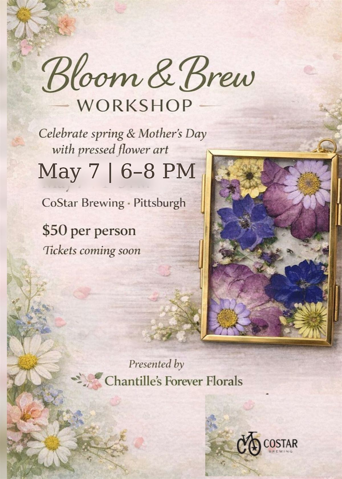 Join Chantille’s Forever Florals for a Bloom & Brew Workshop at CoStar Brewing, where guests will design a beautiful pressed flower art piece inspired by the season. This beginner-friendly workshop is perfect for adults, families, and anyone looking to create a meaningful handmade keepsake.