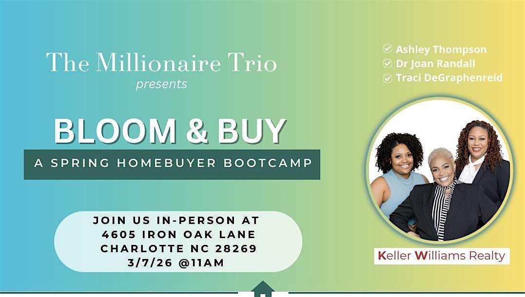 The Millionaire Trio–Ashley, Dr. Joan, Traci, and their partners Brian and Dr. Enashay- invite you to the Spring Homebuyer Bootcamp.