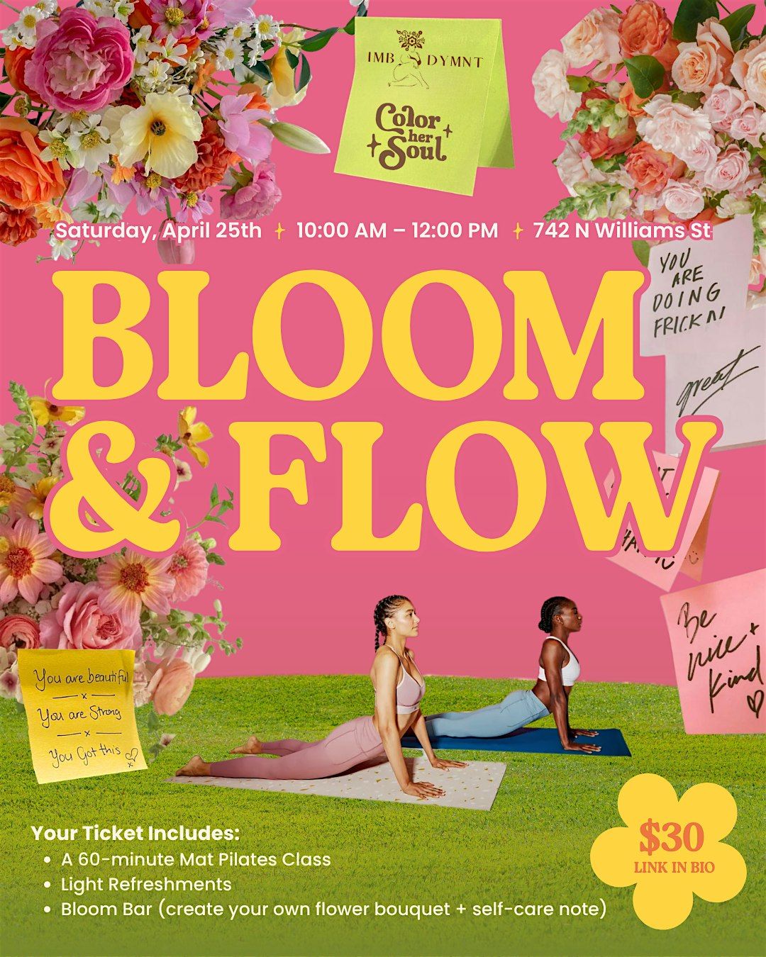 Join us at 742 N Williams St (cheesman park) for a chill and refreshing day at Bloom & Flow! We will begin with a 60 min mat pilates flow led by IMBODYMNT, a body inclusive fitness and wellness community. Whether you're looking to unwind, connect, or just enjoy some good vibes, this event is perfect for you. Mark your calendar for April 25, 2026 at 10:00 AM . Come flow with us and let your creativity bloom in a relaxed, friendly atmosphere. Can't wait to see you there!