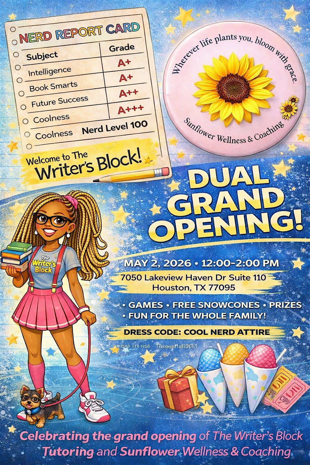 Join us for a fun, family-friendly celebration as we proudly introduce The Writer’s Block Tutoring and Sunflower Wellness & Coaching to the community!