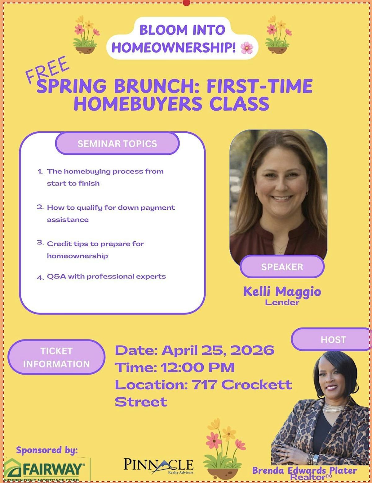 Learn the steps to homeownership while enjoying a beautiful brunch experience! Spring is all about new beginnings and by attending, you’re planting the seed to begin. By the end of our class, you’ll feel confident enough to bloom into the next step to home ownership!