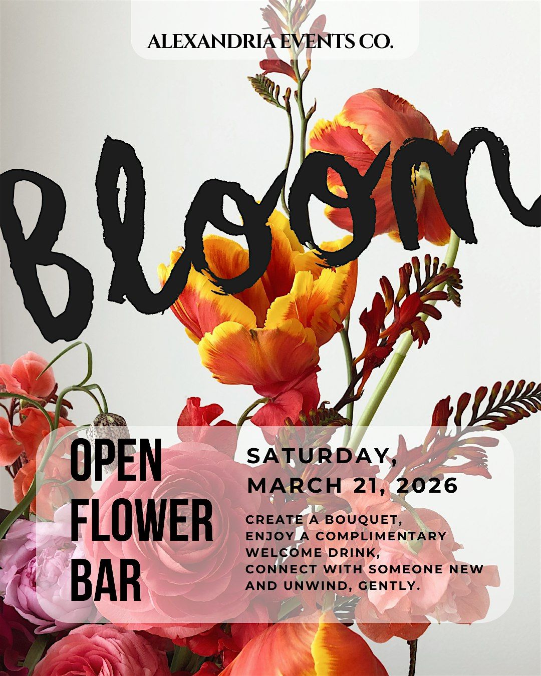 In honor of the spring season — a time of renewal and fresh beginnings — Bloom invites guests to slow down and gather in a thoughtfully curated space. At the heart of the experience is a curated spring flower bar, where guests will create their own bouquet as a gentle, hands-on way to unwind and connect.