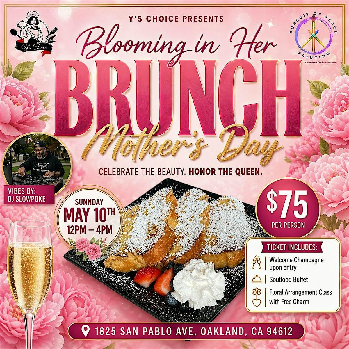 Join us for a beautiful afternoon featuring a delicious soul food brunch buffet by Y's Choice, complimentary champagne on arrival, and a hands-on floral arrangement experience by Pursuit of Peace Painting where you’ll create your own bouquet with a special charm to take home. Enjoy music by DJ Slowpoke while you sip, connect, and honor the queens in your life.