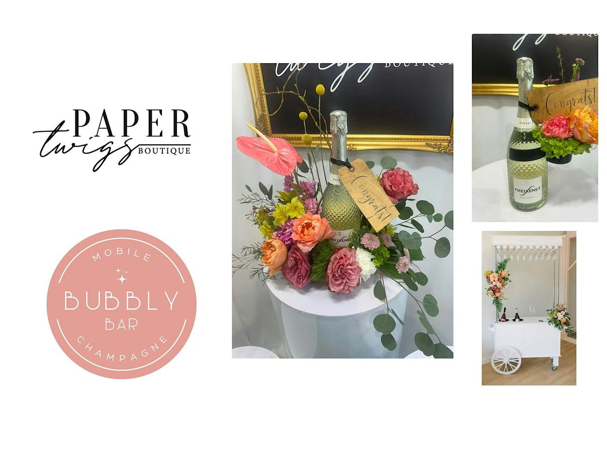 Join us for an unforgettable evening where florals meet fizz at Bubbly and Blooms, a creative experience hosted by the Bubbly Bar, a luxury mobile champagne cart, and Paper Twigs, a beloved floral boutique. This intimate soirée invites you to sip some bubbly while learning how to create a stunning champagne bottle floral arrangement using a wine cuff – a chic accent designed to wrap around the bottle, transforming it into a beautiful centerpiece or gift. Whether you're coming with friends, celebrating something special, or simply treating yourself to a creative night out, this event is designed to feel relaxed, social, and a little bit luxe.