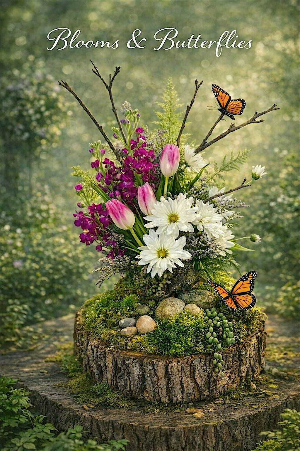 Step into a woodland moment as we design a rustic floral arrangement atop a natural tree cookie slice. Using fresh cut flowers, mosses, stones, branches, bark and a flutter of butterflies, you’ll create a tiny, enchanted landscape that feels alive with the forest. This workshop blends artistry and nature, offering a serene, whimsical piece to brighten your home.