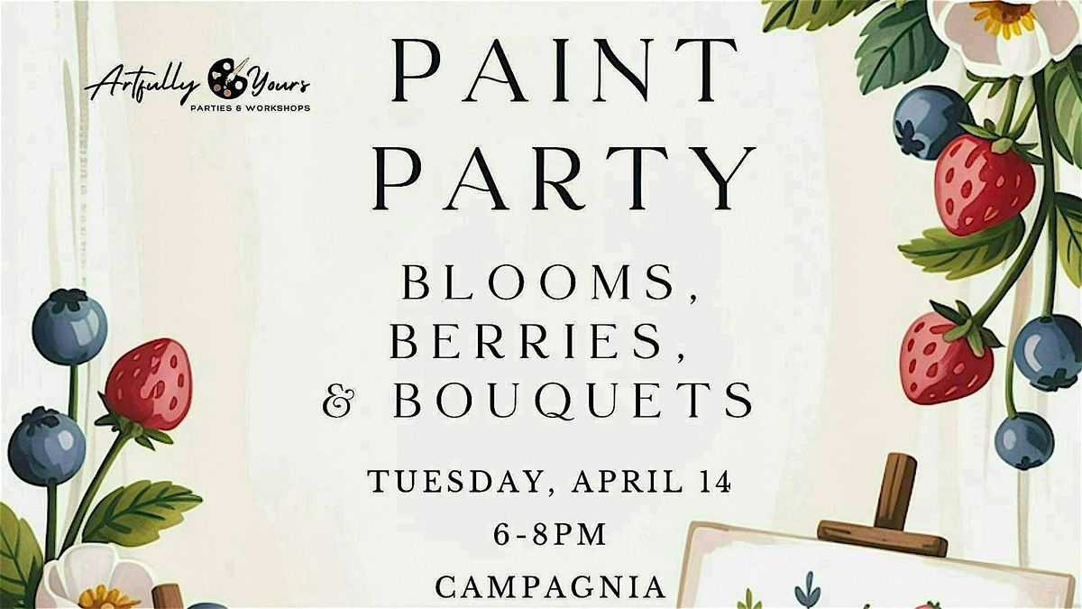 Join us for a fun and relaxed evening at Campagnia Bistro on April 14, 2026 at 6:00 PM (Pacific Time). Bring your creativity and enjoy painting beautiful blooms and berries while sipping on your favorite drinks. No experience needed—just good vibes and a love for creating! Perfect for friends, couples, mothes and daughters, or anyone looking to unwind and get inspired. Can't wait to see your masterpieces!