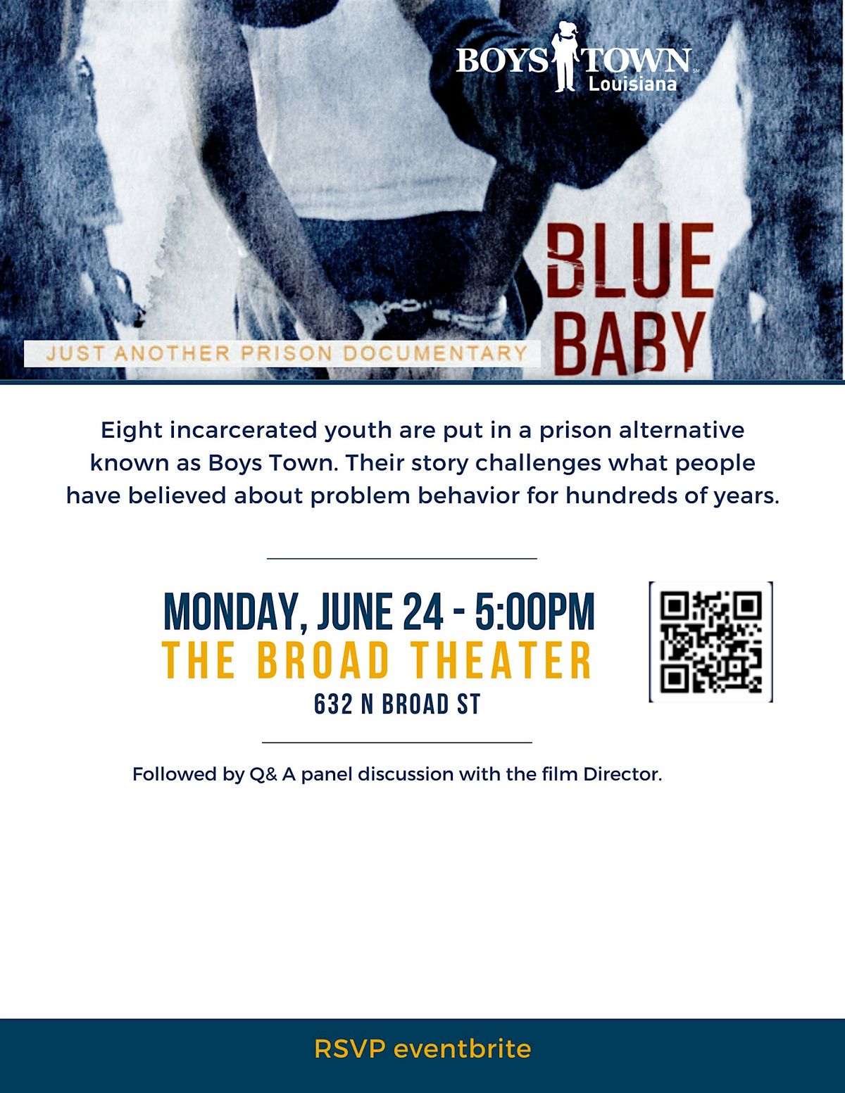 Join us for a special screening of Blue Baby at The Broad Theater! Eight incarcerated youth are put in a Pr*son alternative known as Boys Town. Their story challenges what people have believed about problem behavior for thousands of years.