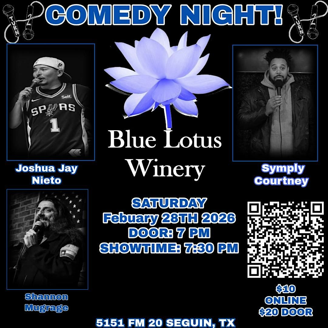 Get ready to laugh your heart out at Blue Lotus Winery on February 28, 2026 at 7:30 PM (Central Time). It's going to be a night full of hilarious jokes and good vibes.