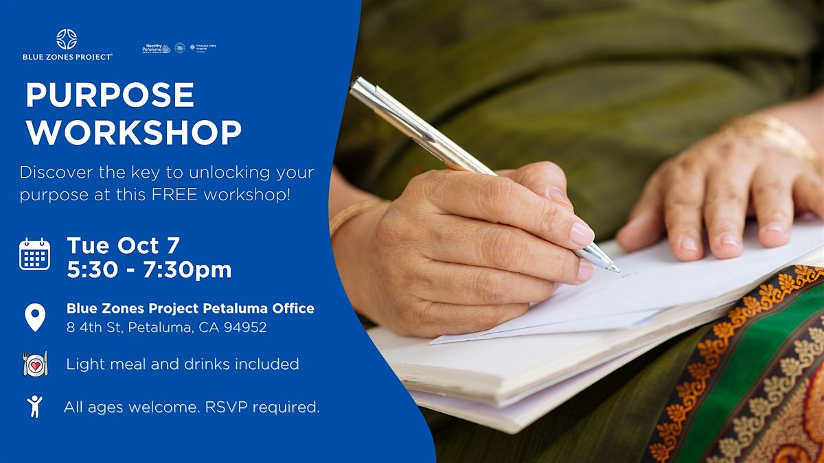Join us on the purpose path! Discover the key to unlocking your true purpose and embark on a life-transforming journey with our free Blue Zones Project Petaluma Purpose Workshop, hosted at the Blue Zones Project Petaluma office.