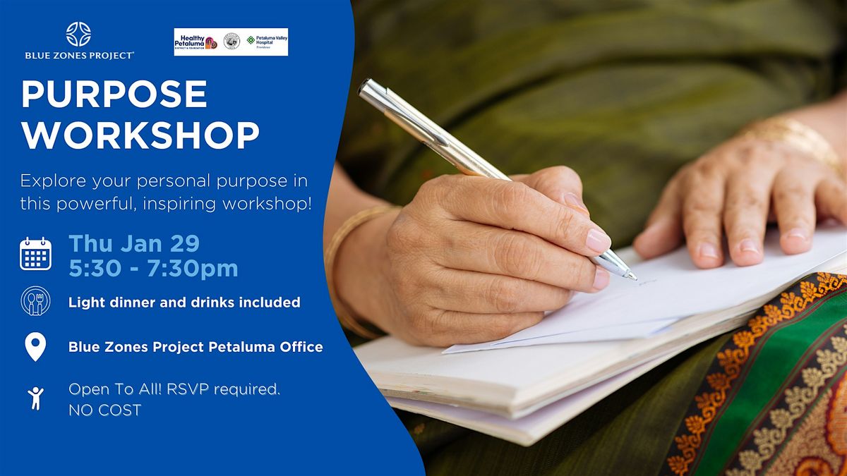 Join us on the purpose path! Discover the key to unlocking your true purpose and embark on a life-transforming journey with our free Blue Zones Project Petaluma Purpose Workshop, hosted at the Blue Zones Project Petaluma office.