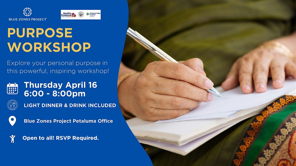 Join us on the purpose path! Discover the key to unlocking your true purpose and embark on a life-transforming journey with our free Blue Zones Project Petaluma Purpose Workshop, hosted at the Blue Zones Project Petaluma office.