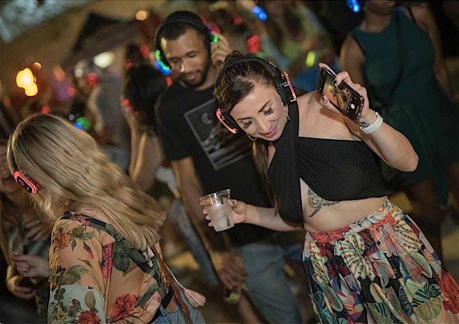 When you arrive, you will receive a pair of special wireless headphones. With a flip of a switch, you can adjust the volume and choose between up to three DJs. Each headset has a color LED that shows what channel you are listening to. It is super social; you’re in control of the music!
