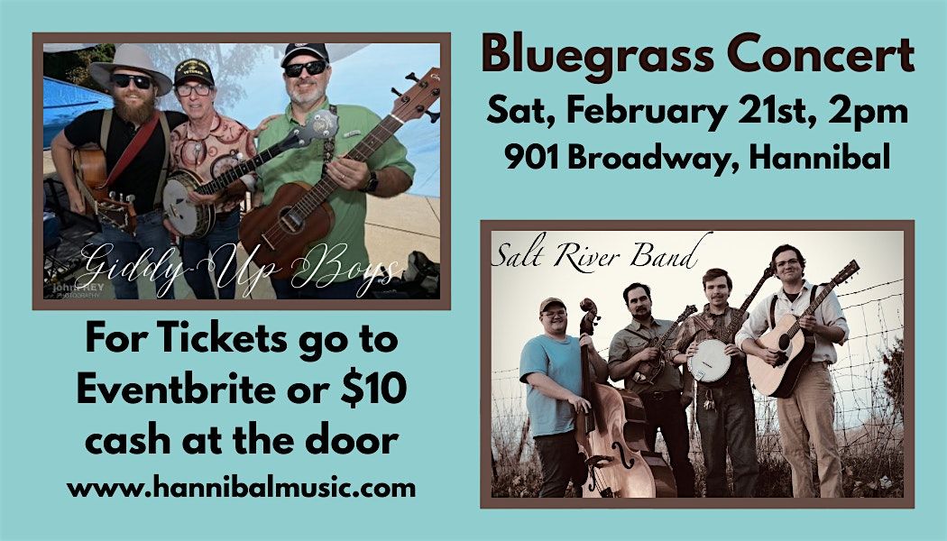 Welcome y'all to the Bluegrass Concert at the Hannibal Music Academy & Performance Hall! Get ready for a toe-tappin', banjo-strummin' good time on February 21, 2026 at 2:00 PM (Central Time). Join us for an afternoon filled with lively tunes and good vibes. Don't miss out on this opportunity to experience the magic of bluegrass music in person. Grab your friends and family, and we'll see y'all there!