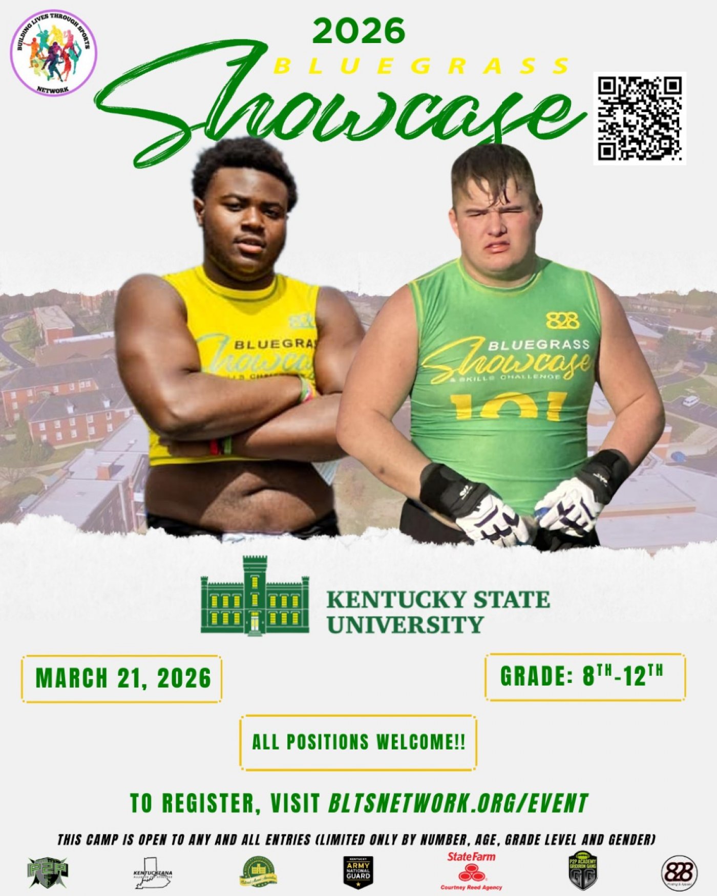 The annual Bluegrass Showcase is the FIRST and ONLY multi-event camp in AMERICA! The FOOTBALL CAMP features not only a football camp, but also a campus tour of Kentucky State University and a What's Next After High School seminar. This event is structured to provide comprehensive athletic evaluations and information for both athlete and parent regarding the college recruiting process. Each student-athlete will be able to gain exposure from local media and various recruiting services. In ordinance with the NCAA and NAIA regulations college coaches MAY BE in attendance.