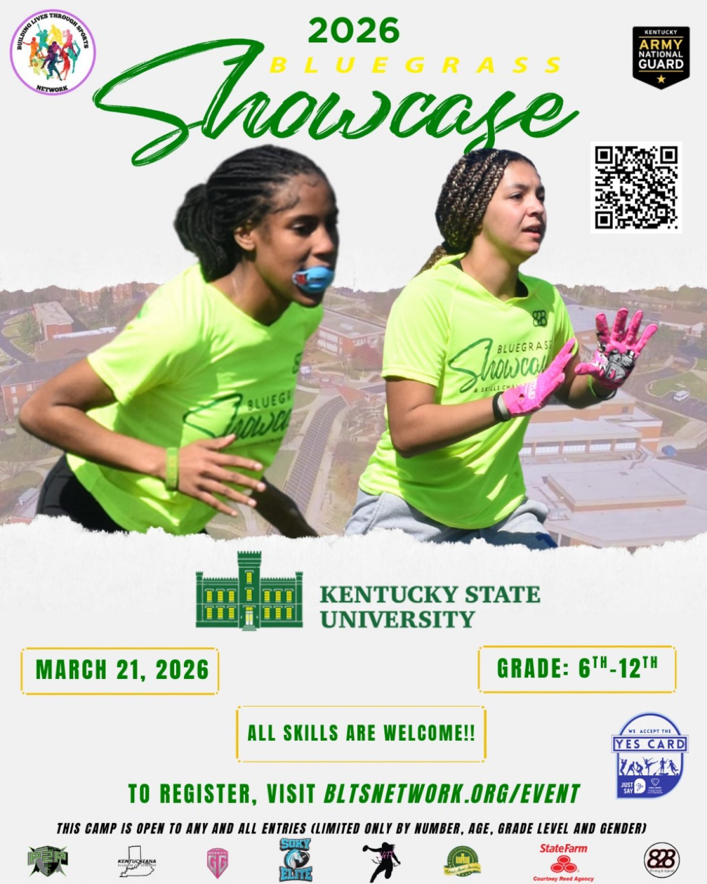 The annual Bluegrass Showcase is the FIRST and ONLY multi-event camp in AMERICA! The GIRL'S FLAG FOOTBALL CAMP features not only a girl's flag football camp, but also a campus tour of Kentucky State University and a What's Next After High School Seminar. This event is structured to provide comprehensive athletic evaluations and information for both athlete and parent regarding the college recruiting process. Each student-athlete will be able to gain exposure from local media and various recruiting services. In ordinance with the NCAA and NAIA regulations college coaches MAY BE in attendance.