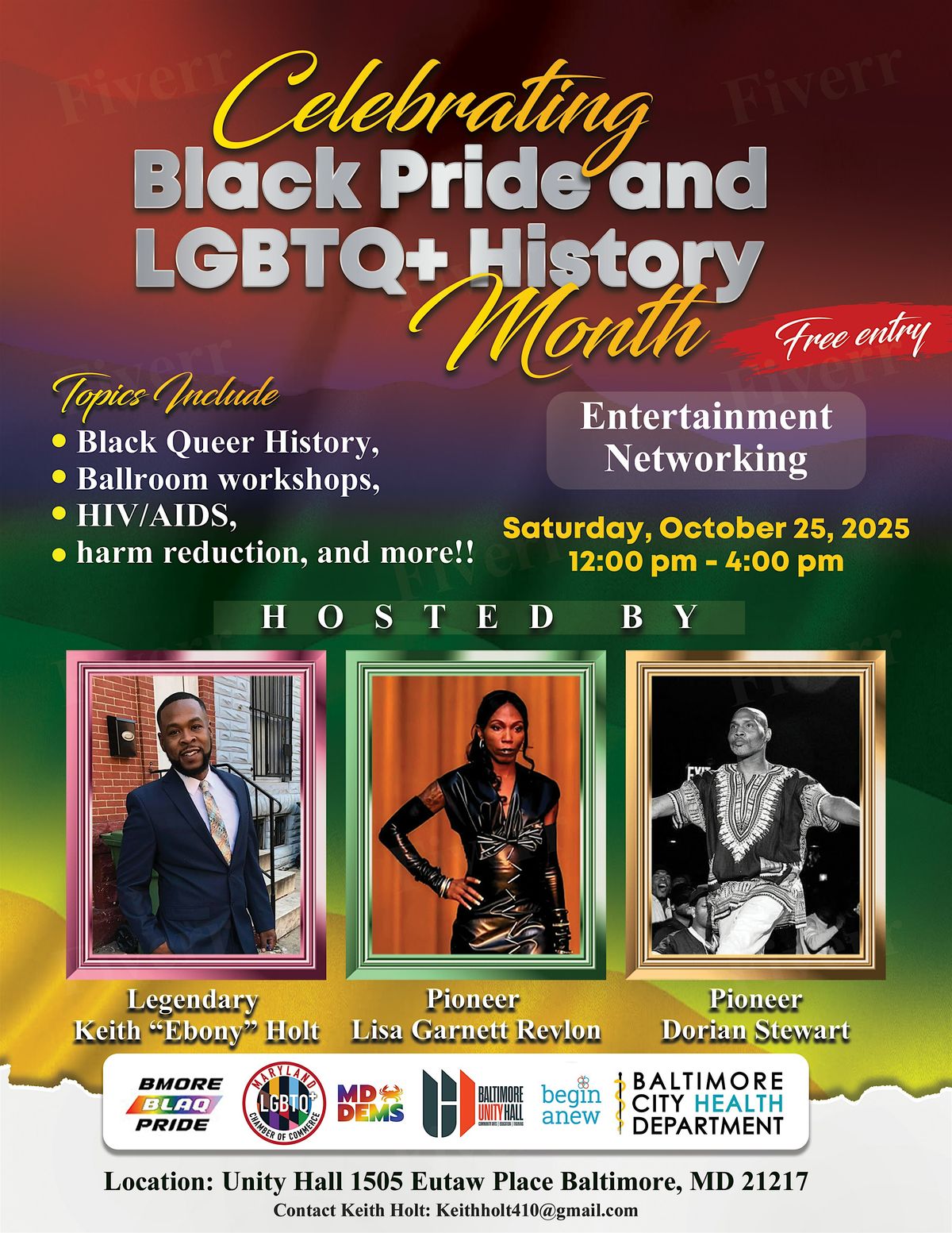 Attendees can expect an inspiring celebration filled with informative workshops, powerful community conversations, and vibrant entertainment honoring Black Pride and LGBTQ+ History Month. The event will feature sessions on Black queer history, ballroom culture, HIV/AIDS awareness, entrepreneurship/business, harm reduction, and so much more led by legendary hosts and pioneers in the LGBTQ+ community. Enjoy opportunities for professional networking, chats with advocates, and skill-building activities aimed at fostering collaboration and connection within Baltimore’s diverse LGBTQ+ community. Expect a welcoming space to build partnerships, support services, and learn about fundraising efforts alongside trusted local organizations, all while engaging with community.