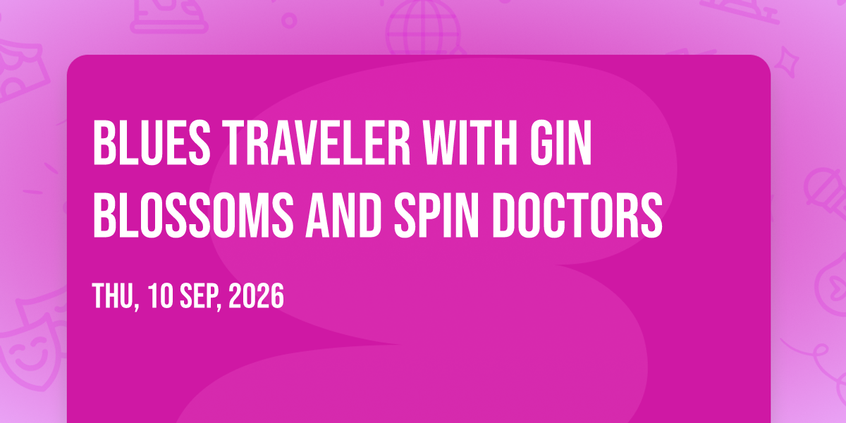 π Location: 41.5592, -93.6748π Step into a world of wonder at Blues Traveler with Gin Blossoms and Spin Doctors, where extraordinary moments await! ποΈ Located at Lauridsen Amphitheater at Water Works Park in dynamic Des Moines, IA, this event will become the talk of the town. π Join us on September 10th, 2026 at 11:00 PM for a celebration that defies the ordinary. β¨ This curated experience brings together the best of entertainment, culture, and community spirit. Every detail has been thoughtfully planned to ensure an unforgettable experience for all our guests. π― Take advantage of this opportunity to be part of something special. π Early registration is recommended as space is limited!