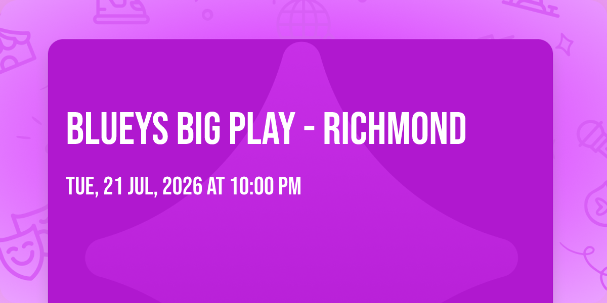 π Location: 37.5462, -77.4522β¨ Discover the extraordinary at Blueys Big Play - Richmond, where magic meets reality in ways you've never imagined! ποΈ Set in Altria Theater nestled in bustling Richmond, VA, this event promises to be a landmark occasion. π Taking place on July 21st, 2026 at 10:00 PM, it's going to create an atmosphere where every moment becomes a cherished memory. π Immerse yourself in an experience crafted with attention to every detail, designed to surprise and delight at every turn. They have worked tirelessly to ensure this event exceeds all expectations, bringing together elements of entertainment, innovation, and pure joy. π Don't miss your chance to be part of this remarkable journey!