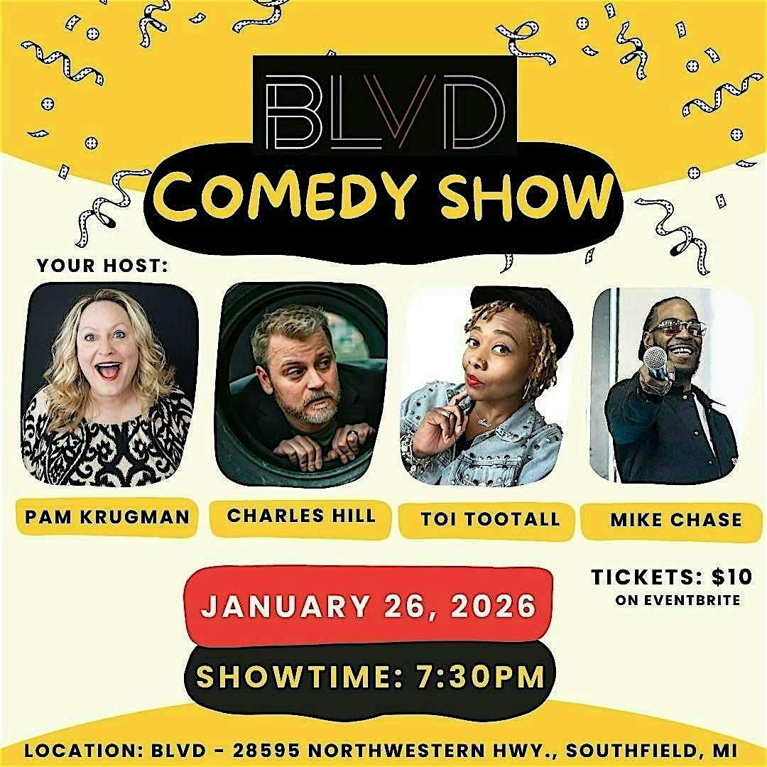 Join us at BLVD in Southfield for a night full of hilarious jokes and good vibes on Monday, January 26th at 7:30pm! Pam Krugman will host for the very funny Charles Hill, Toi Tootall, and Mike Chase. Tickets are only $10. Great food & drinks. (BLVD: 28595 Northwestern Hwy. in Southfield)