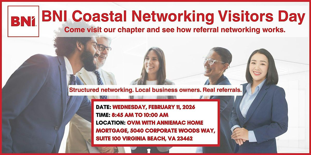 You’re invited to visit BNI Coastal Networking for a special Visitors Day. This is your chance to experience a real BNI chapter meeting, meet local business owners, and learn how referral networking works when it’s done with structure and consistency.