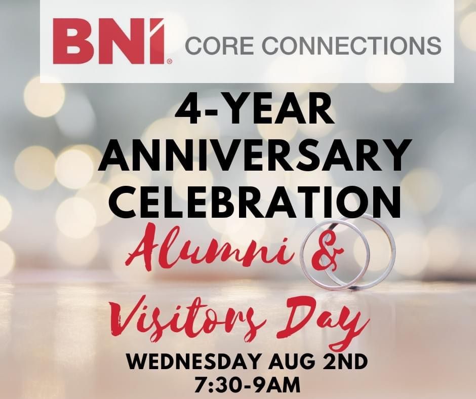 Join us in celebration of our 4 YEAR ANNIVERSARY of BNI Core Connections! Are you looking to grow your business with high quality referrals from the best team? We are inviting all visitors to join the party to see what all the fun is about!