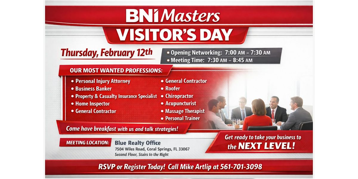 Hey there! Join us in person for the BNI Masters-Visitors Day — a fantastic chance to connect, network, and discover what BNI is all about. Whether you're curious about expanding your business or just want to meet new people, this is the event for you. Come along, bring a friend, and experience a day full of opportunities and good vibes. Don’t miss out!