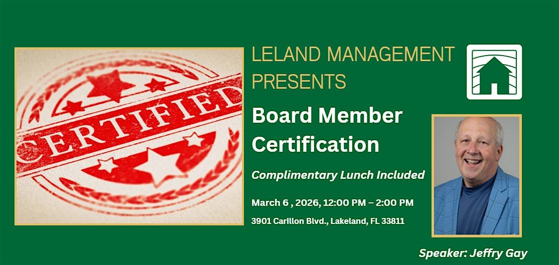Leland Management is pleased to offer this complimentary in person class for Homeowner Association Board Member Certification. This course meets Florida State requirements for new Board Member certification and is also ideal for anyone looking for the knowledge and tools necessary to make their job as a Board Member easier. Course, materials, lunch and certificates are provided at no cost. Presented by Jeff Gay, Director at Leland Management.