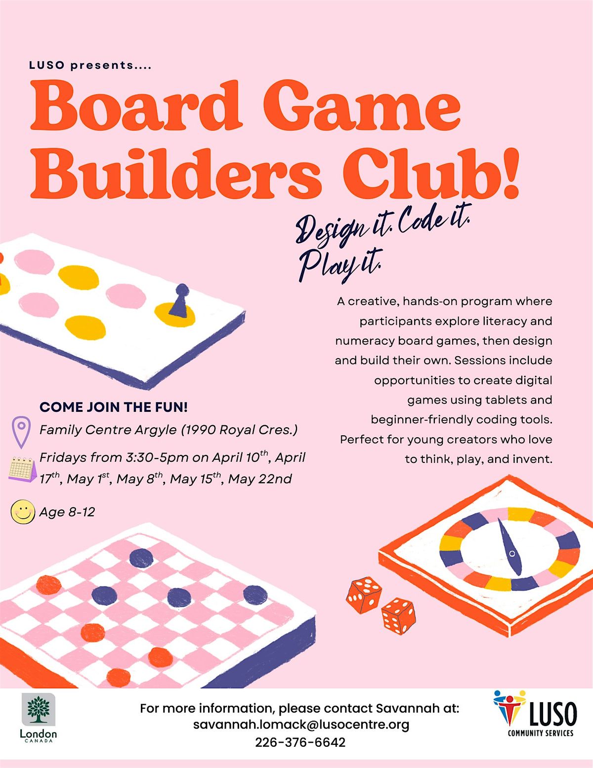 Hey there! Love board games? Join our Board Game Builders Club where you get to design, create, and play awesome new games with fellow enthusiasts. This is an in-person event, perfect for sparking creativity and making new friends. Whether you're a newbie or a seasoned gamer, come hang out, build cool boards, and share your ideas. Don't miss out on the fun – your next favorite game could start here!