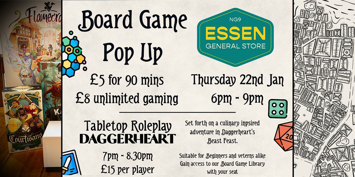 Play some Board Games with us at Essen General Store or sign up for a intro session of Daggerheart.