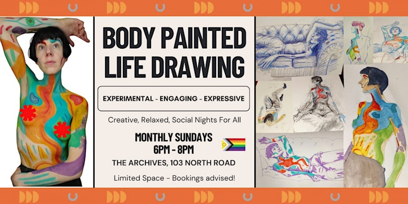 Across 2 hours, a life model who has been part body-painted will present a variety of poses for you to sketch, paint (or any other art medium you wish!), holding each pose from 10-40 minutes each time.