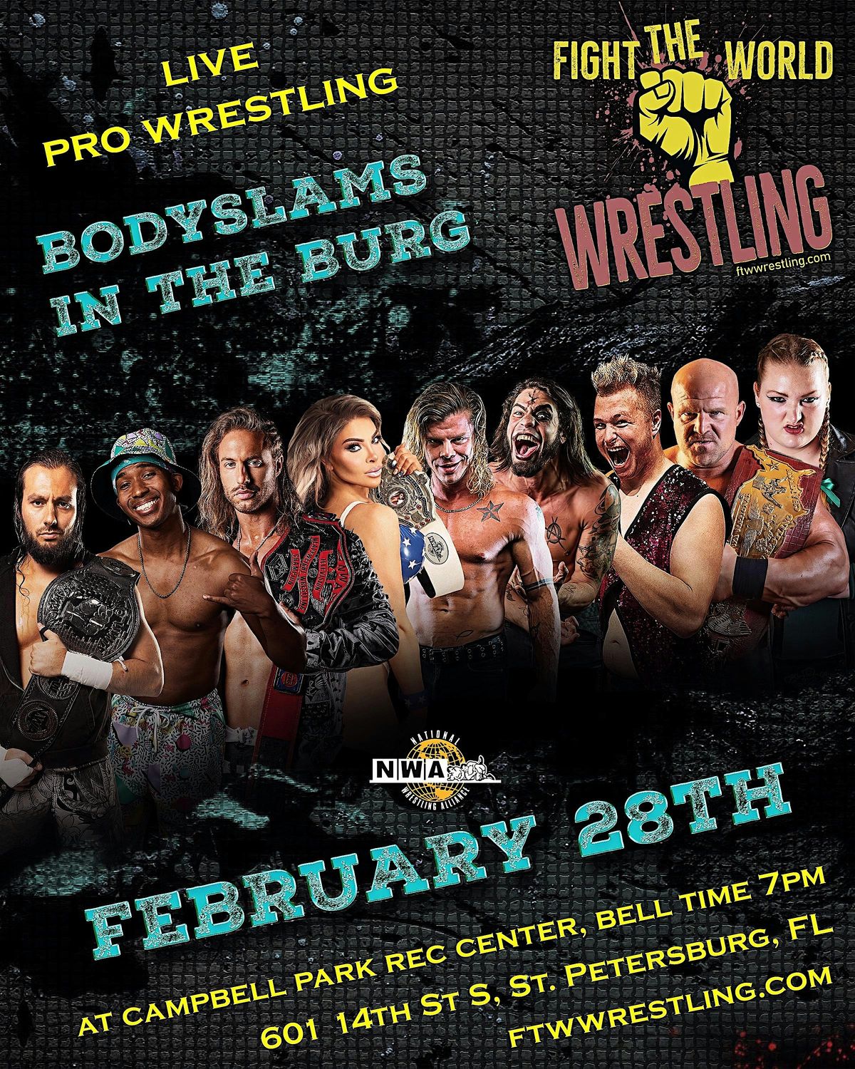 Come join us in person for an epic night of wrestling action at Bodyslams In The Burg! Feel the energy, cheer for your favorites, and soak in the live atmosphere as the best wrestlers throw down right before your eyes. Featuring NWA Favorite Champions , Bryan Idol, Natalia Markova, Mike Mondo, as well as Daisy K*ll, Alex Misery along side all of your favorite Fight The World Wrestling Stars!Don’t miss out on the thrills and spills—it's gonna be a blast!
