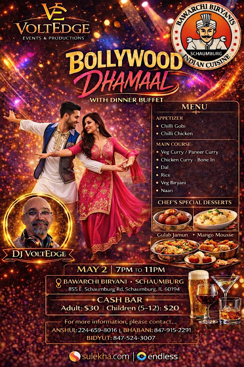 Get ready for an unforgettable evening filled with Hindi, English, and Multilingual rhythms, tantalizing fusion food, and electrifying dance performances! Dhamaka presents 'Bollywood Dhamaal with Dinner' on the 2nd of May, 2026. This celebration of music and gastronomy promises to be a memorable experience, combining the vibrancy of Bollywood with the delights of a sumptuous dinner. Be part of this enchanting evening and let the combination of foot-tapping music and delicious food take you on a unique journey.