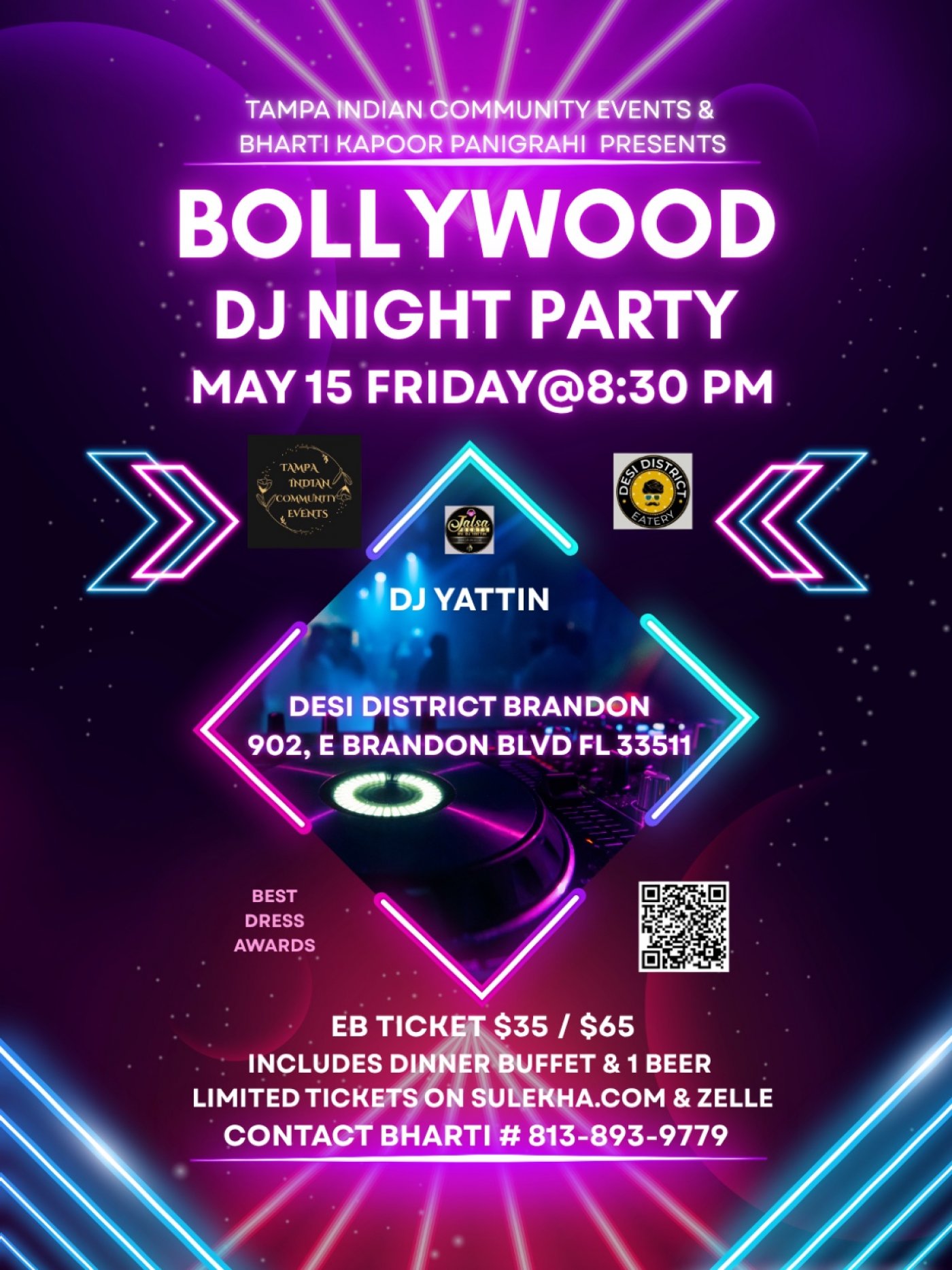 Tampa Indian Community Events and Bharti Kapoor Panigrahi cordially invite you to an evening of Bollywood music and entertainment featuring DJ Yattin.