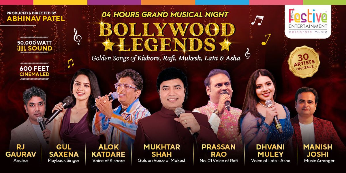 Festive Entertainment presents the blockbuster show of the year, named "BOLLYWOOD LEGENDS"—a 04-hour grand musical night with India's top voices & 30 artists on stage.